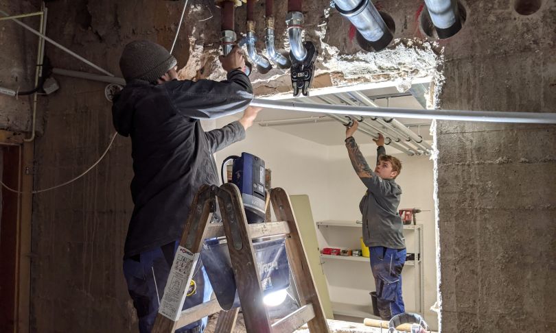 Es geht voran! Decke und Boden der Heizzentrale werden komplett neu betoniert. Unsere Elektriker und Heizungsinstallateure verlegen insgesamt 4 Kilometer Rohre und Kabel. Das entspricht der Länge der Schatzbergbahn!