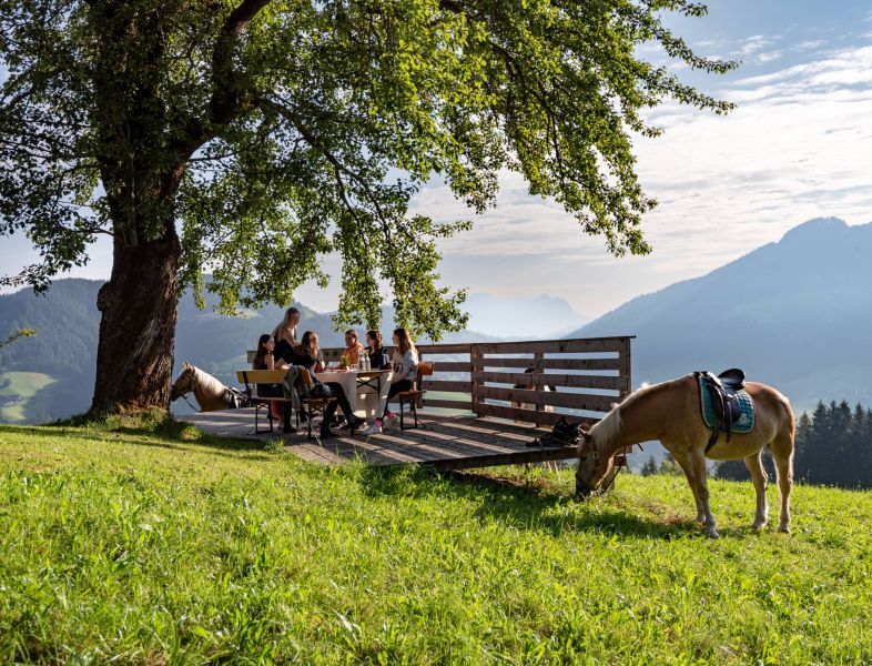 Früh losreiten und oben einkehren: Nach dem Ritt wartet ein Frühstück am Berggasthof mit Aussicht, danach geht es entspannt zurück ins Tal.