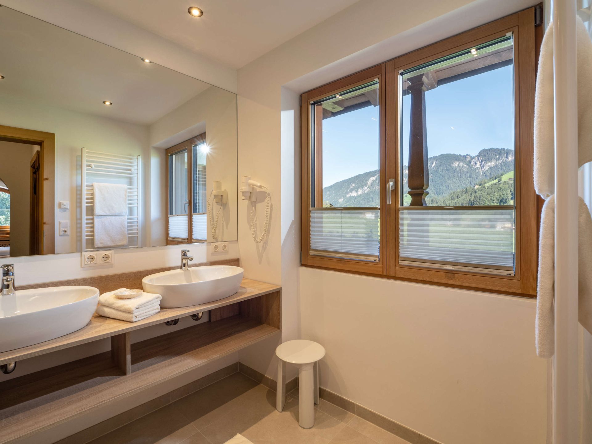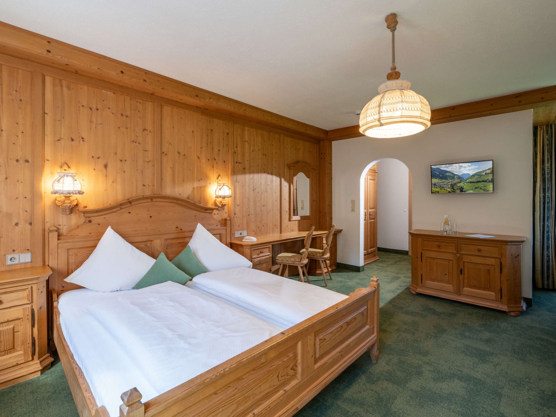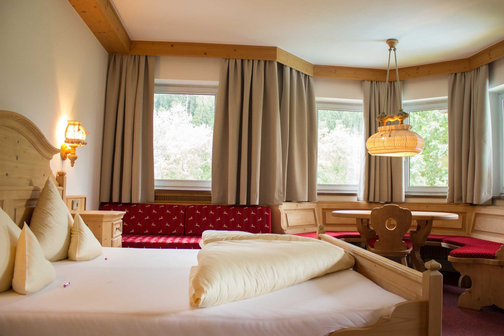 Diese großen Zimmer sind mit viel hellem Holz im Tiroler Stil eingerichtet, verfügen über einen Balkon teils mit Blick in den Garten, teils über die Wiesen, verfügen zum Teil über Erker mit Sitzecke und bieten Komfort und Platz für bis zu vier Personen.