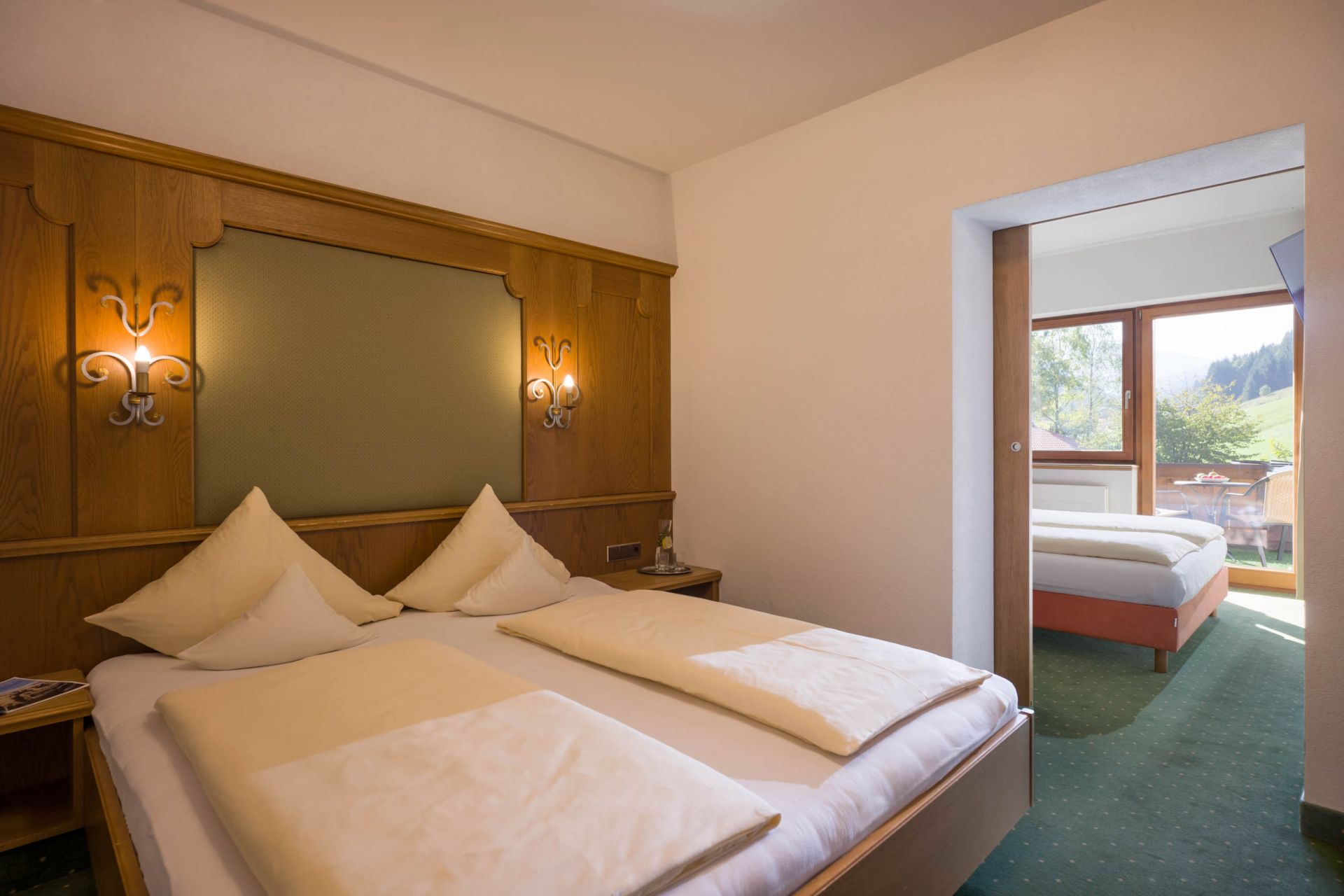 Südseitige Suite mit zwei Schlafräumen und Terrasse mit Blick auf Garten und Breiteggspitze