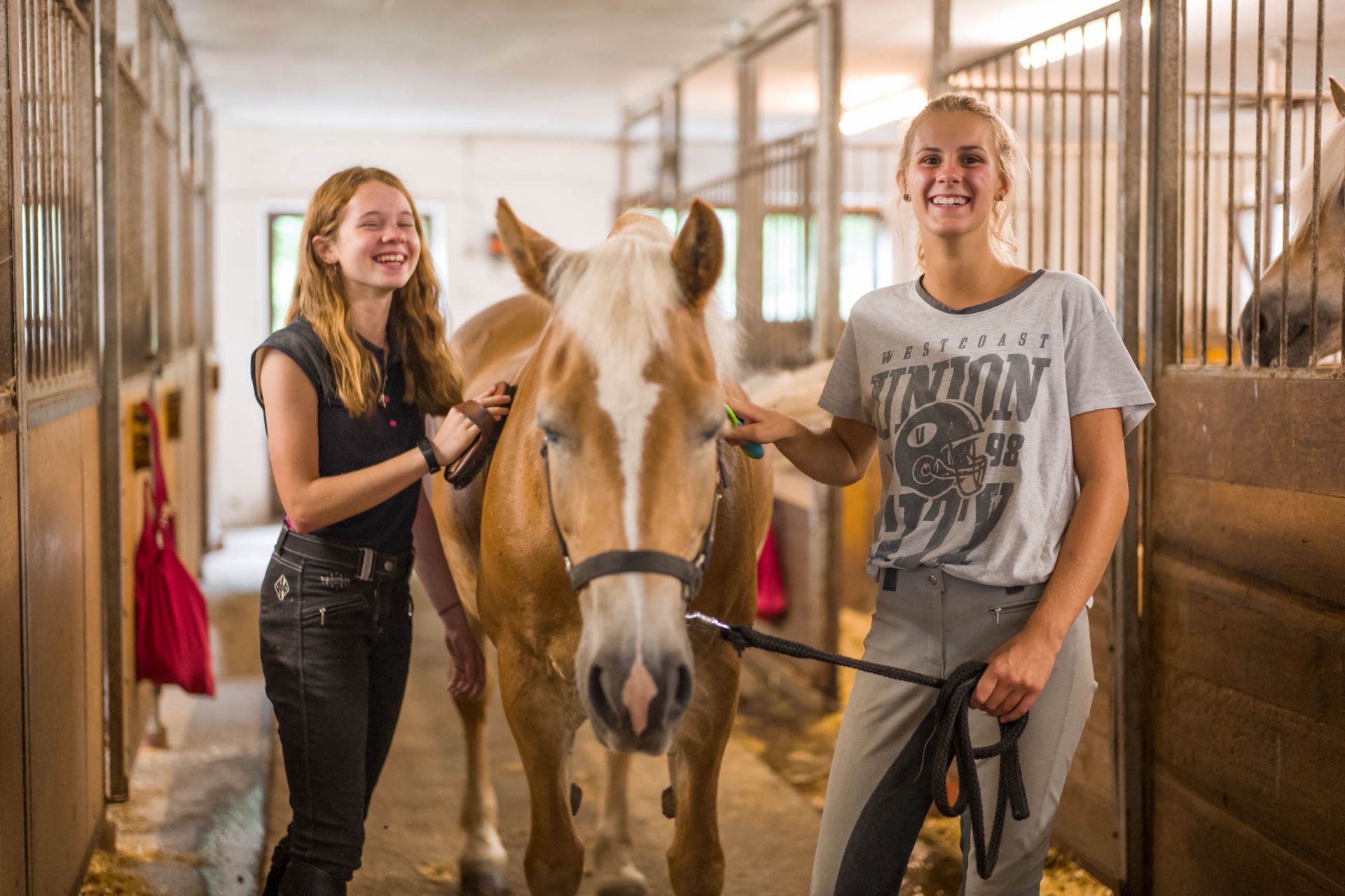 Vom ersten Kontakt bis zum sicheren Sitz: In der Reithalle trainieren Sie mit unseren Lehrern (auf Anfrage auch im Winter). Dazu kommen tägliche, geführte Ausritte abseits vielbefahrener Straßen. Für besondere Momente sorgen Frühstücksritt oder Almritt – und für Kinder Ponyreiten und -führen auf Anfrage.